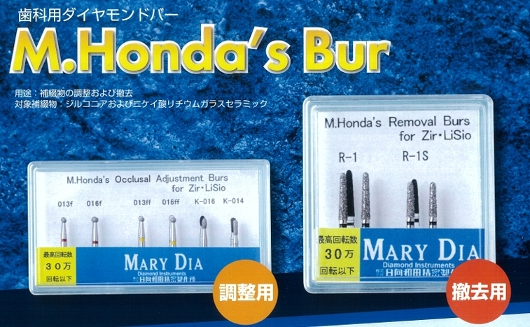 ●調整用のバーの先の球径部分にダイヤ粒子がしっかり付けられており、直径は約1~2mm位で咬合接触点が付与しやすい形になっています。また、撤去用バーのダイヤ粒子は少し荒くしており、強度の高いジルコニアでも容易に撤去ができます。